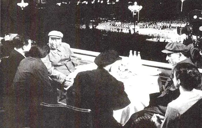 了解林彪底细的人都知道,林彪战争年代负伤曾经用吗啡止痛,结果上了瘾,后来不用就不行。果然这天晚上,林彪也因身体原因,不想去城楼,是周总理电话再三请他出席晚上的活动,他才不得不来。他带着一副萎不振的模样出现在人们视线里,冷僻地落座后,一句话没说。和近在咫尺的毛泽东没有握手,没有说话,甚至没有看一眼,只是一味地耷拉着焦黄的脸……而拍摄一般要等正副统帅交谈时才开始。