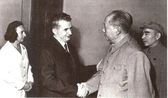毛泽东、林彪在人民大会堂与罗马尼亚总统齐奥塞斯库及夫人会面。