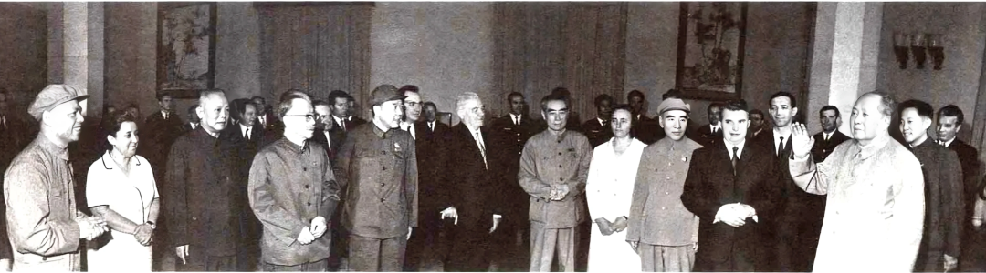 拍电影的记者还在对着毛泽东的方向调试镜头。不知怎的,杜修贤被眼前的瞬间吸引住了,鬼使神差地立在董必武的侧面,拍了一张主桌的全景。再看看人物表情特别是林彪的表情没有进入状态,他便放下相机,没有再拍,转到别处找镜头了。