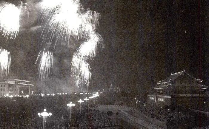 天安门广场上却人声鼎沸,锣鼓喧天。广场四周的建筑物穿上彩色灯装,光线像画笔样生动真实地勾画出人民大会堂、英雄纪念碑、历史博物馆交错重叠的层次和轮廓。“战无不胜的毛泽东思想万岁!”、“全世界各民族大团结万岁!”的巨幅霓虹牌耸立在广场上,光芒闪烁。