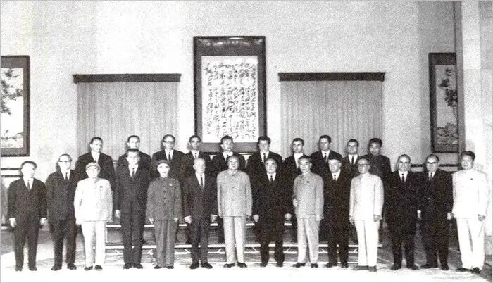 1970年6月11日,毛泽东、林彪、周恩来、康生(前排右四).陈伯达(前排左四)五位政治局常委在人民大会堂会见罗马尼亚领导人。